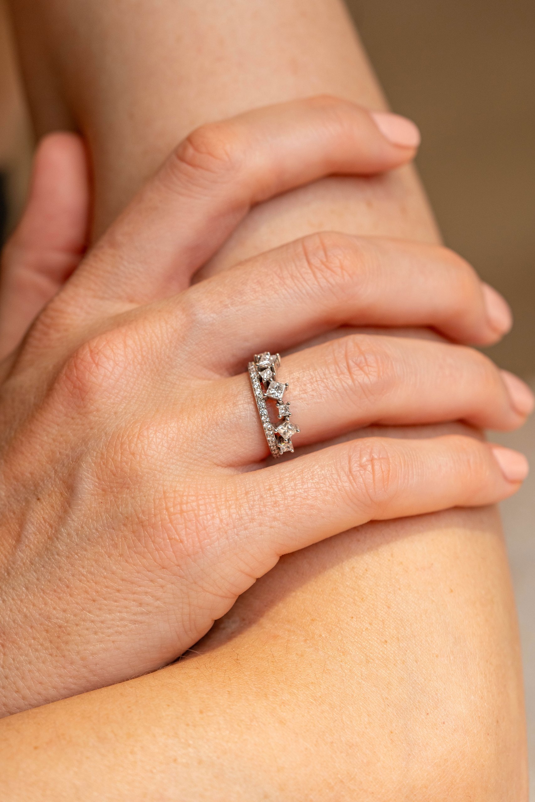 – En or 18 carats, cette bague est sertie de 3 diamants princesses de 3 mm et de 4 diamants princesses de 2 mm sublimés par une ligne de 21 diamands ronds.