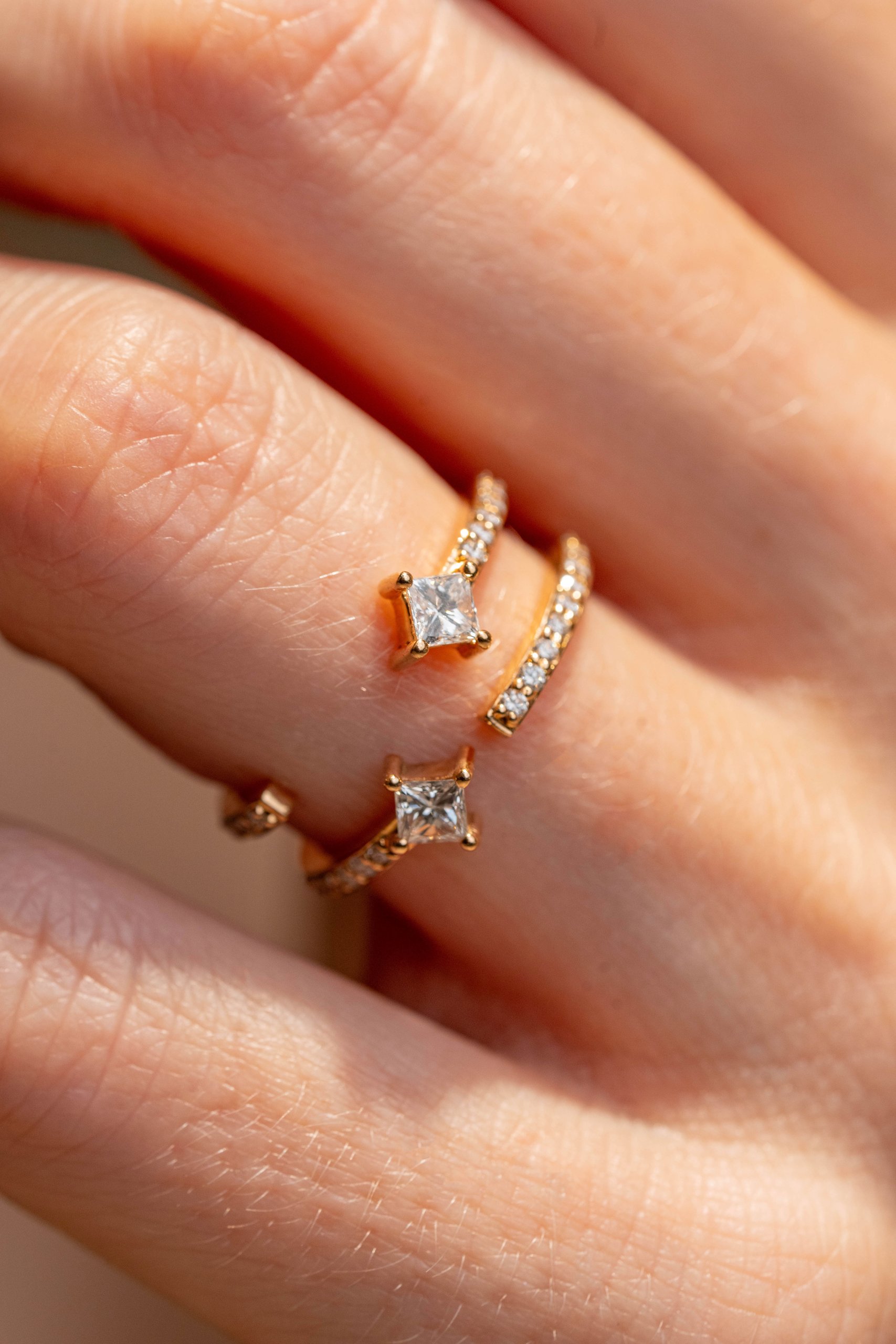 – En or 18 carats, cette bague est ornée de 2 princesses de 3 mm et d’un pavage de 25 diamants ronds.