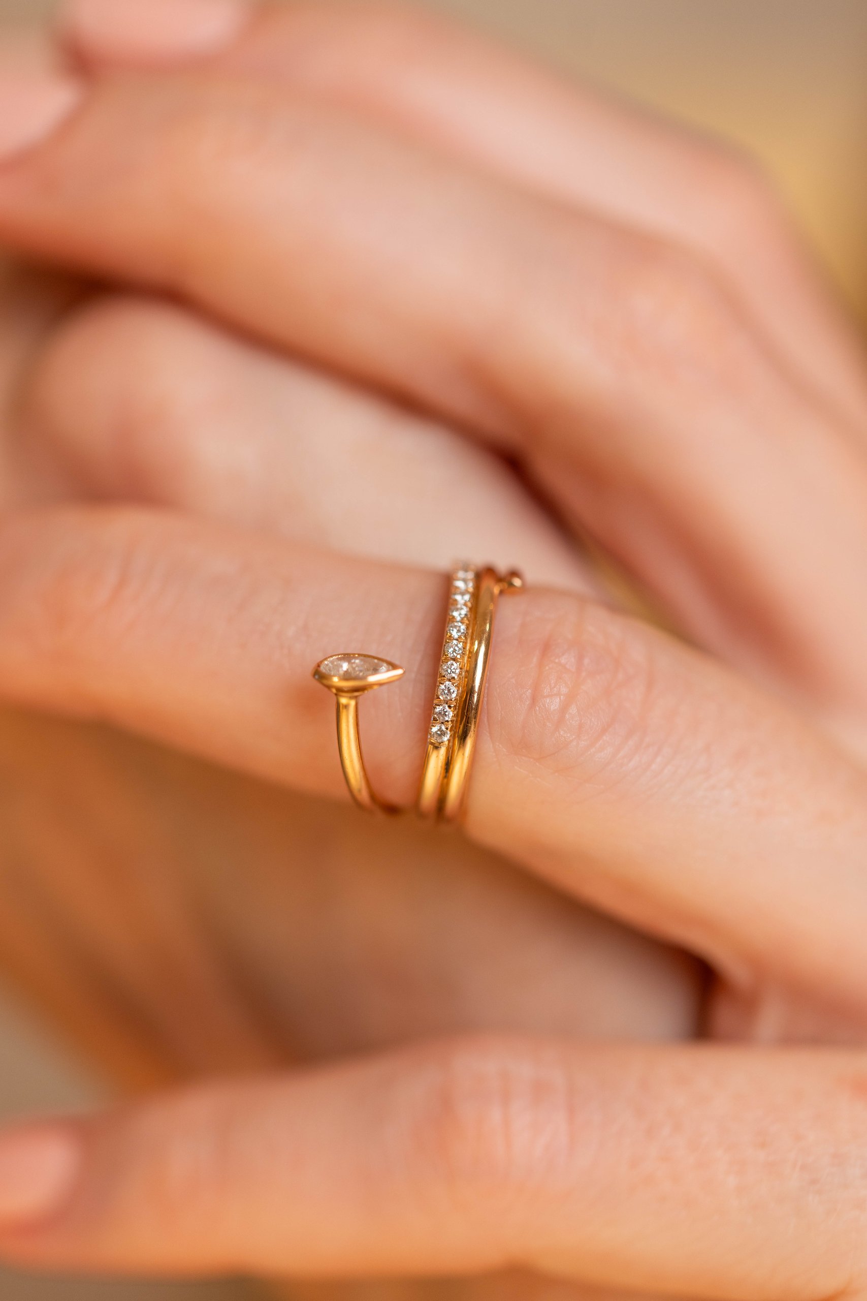 – Une bague au port original avec sa poire décentrée qui se porte entre deux doigts.