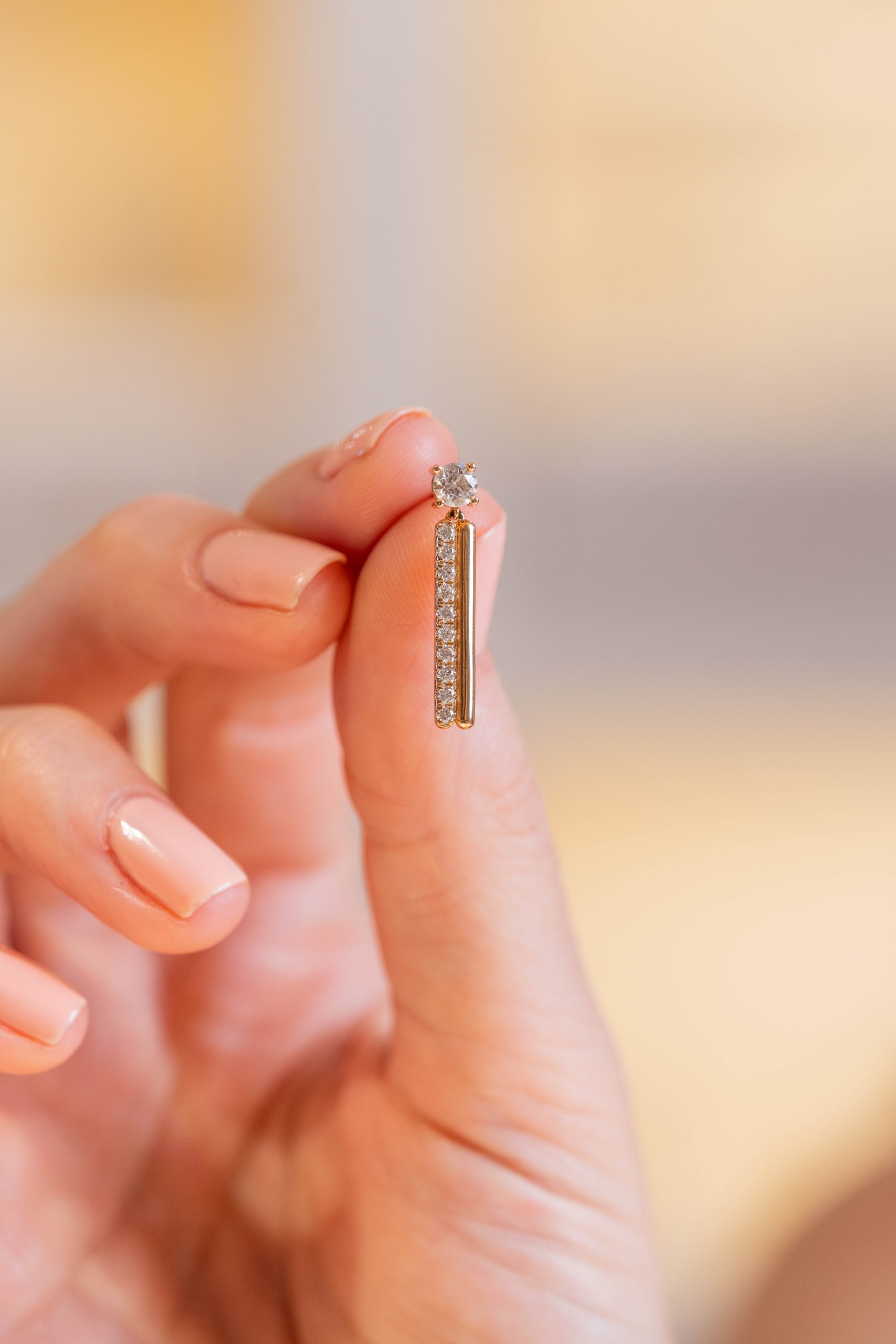 – En or 18 carats, chaque boucle d’oreille est ornée d’une pierre de 4 mm et sertie de 10 diamants.