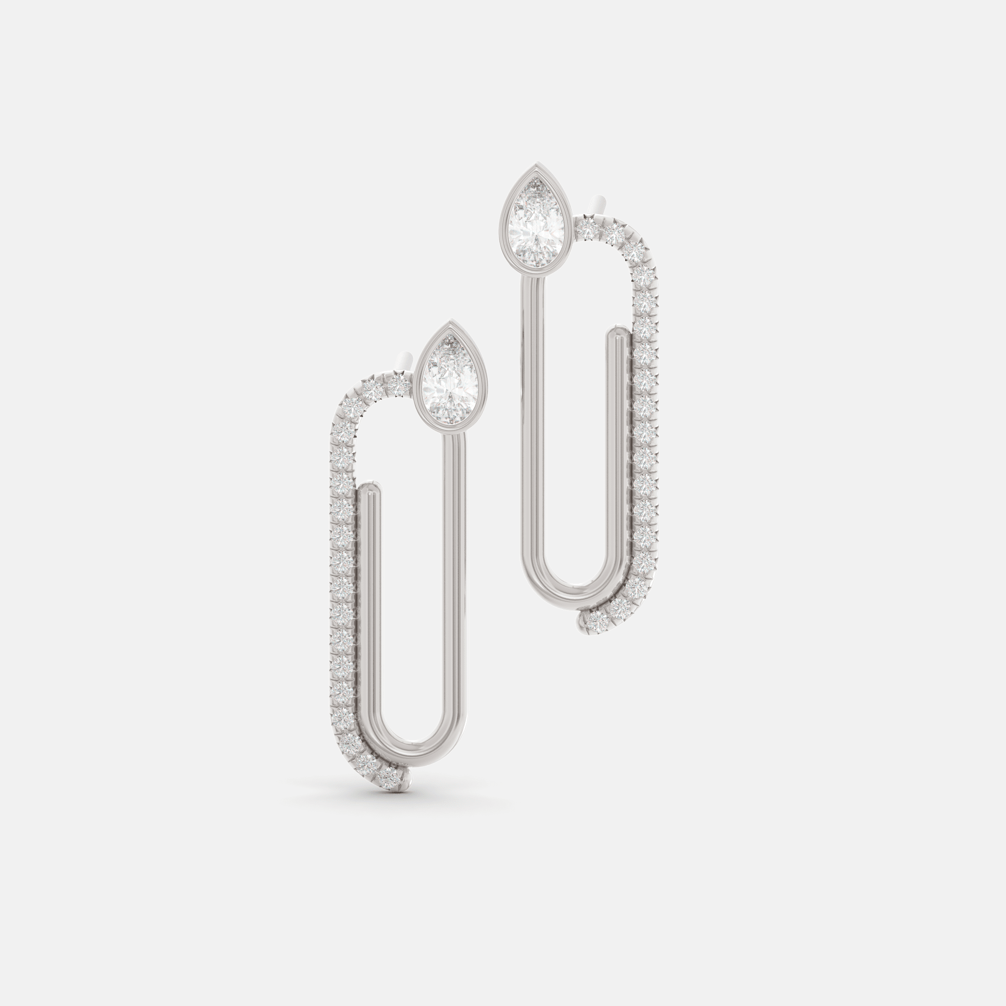 – En or 18k, ces boucles d’oreilles sont serties de deux poires de dimensions 5×3 mm sublimées par un pavage minutieux de 36 diamants ronds qui captent la lumière à chaque mouvement.