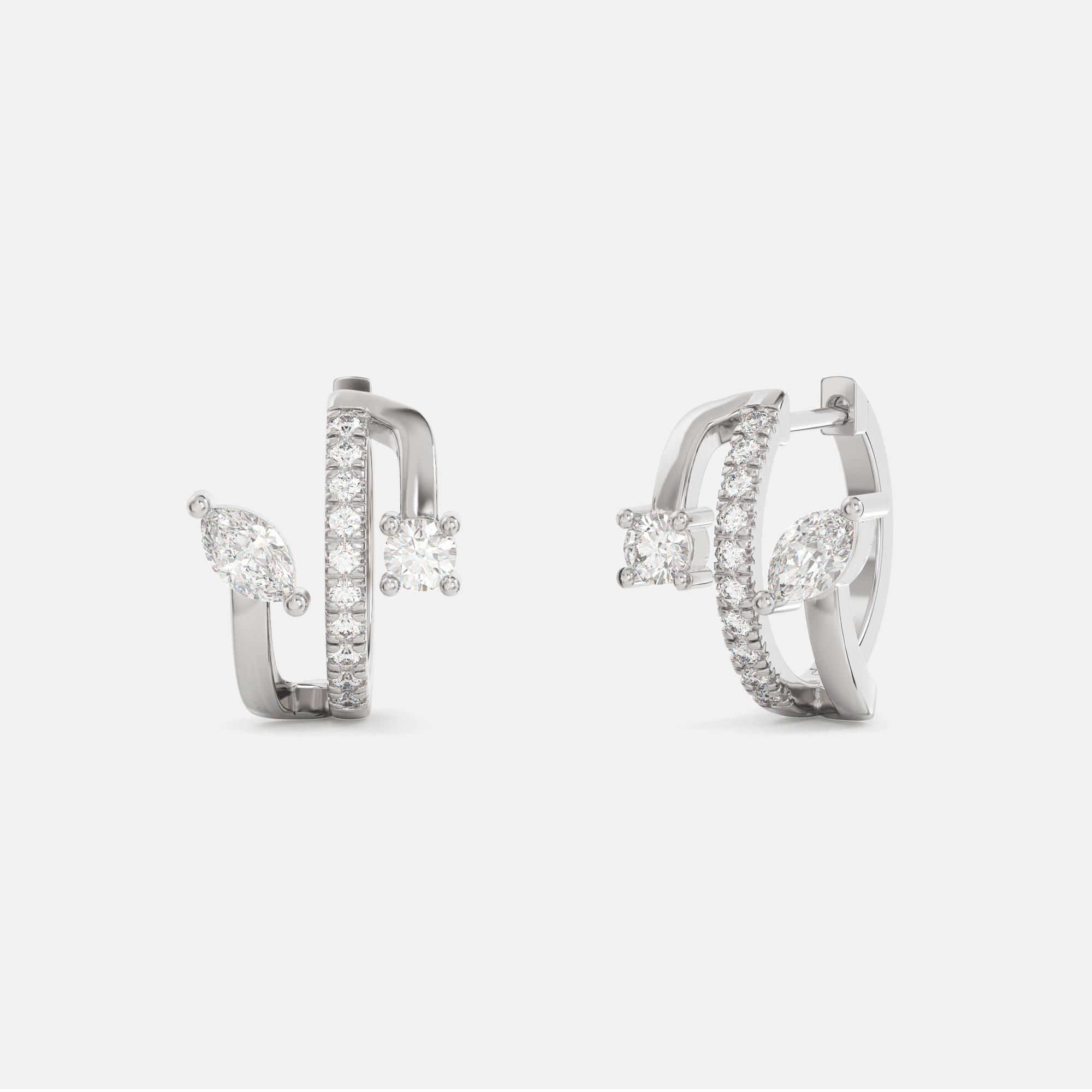 – Des boucles d’oreilles en or 18 carats serties de deux pierres marquises 5×3 mm, de deux pierres rondes de 3 mm et d’un pavage de 20 diamants ronds.