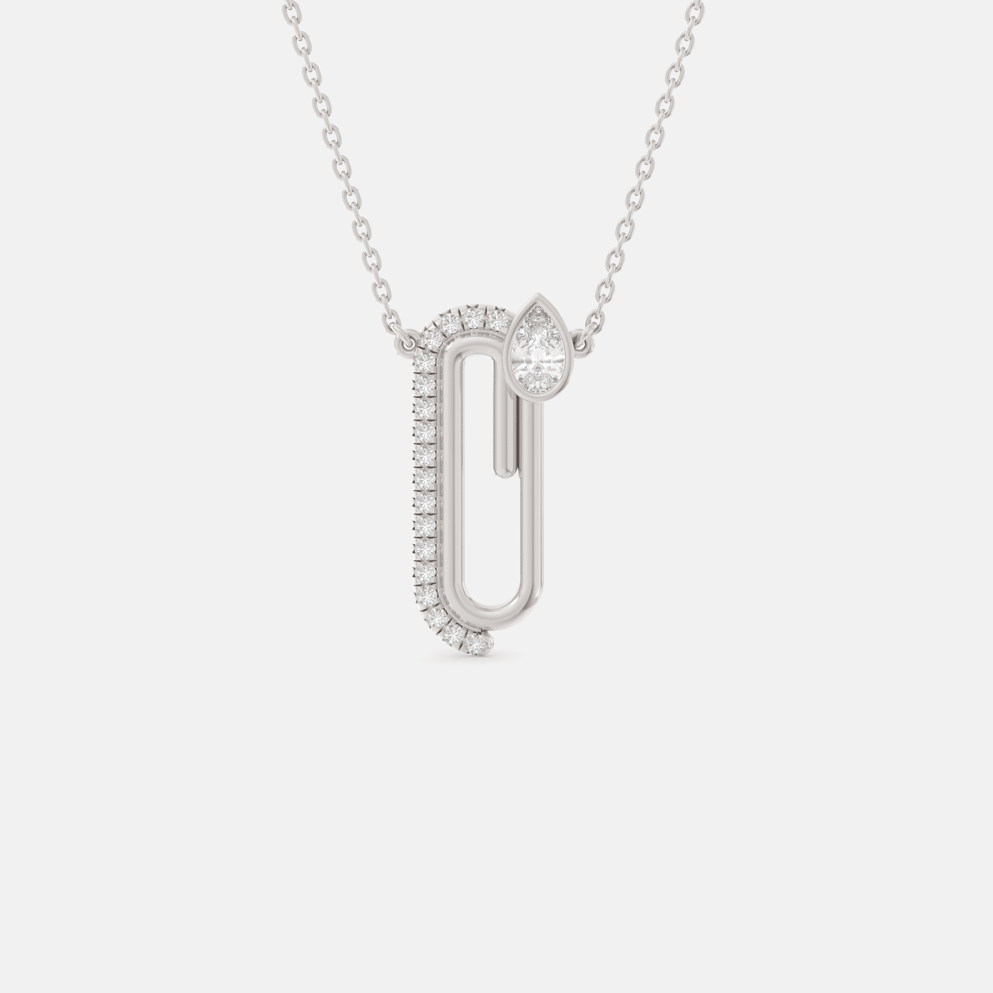 – Conçu en or 18k, ce pendentif est orné d’un pavage de 18 diamants ronds et d’une poire de dimensions 5×3 mm, reflétant la lumière à chaque mouvement.