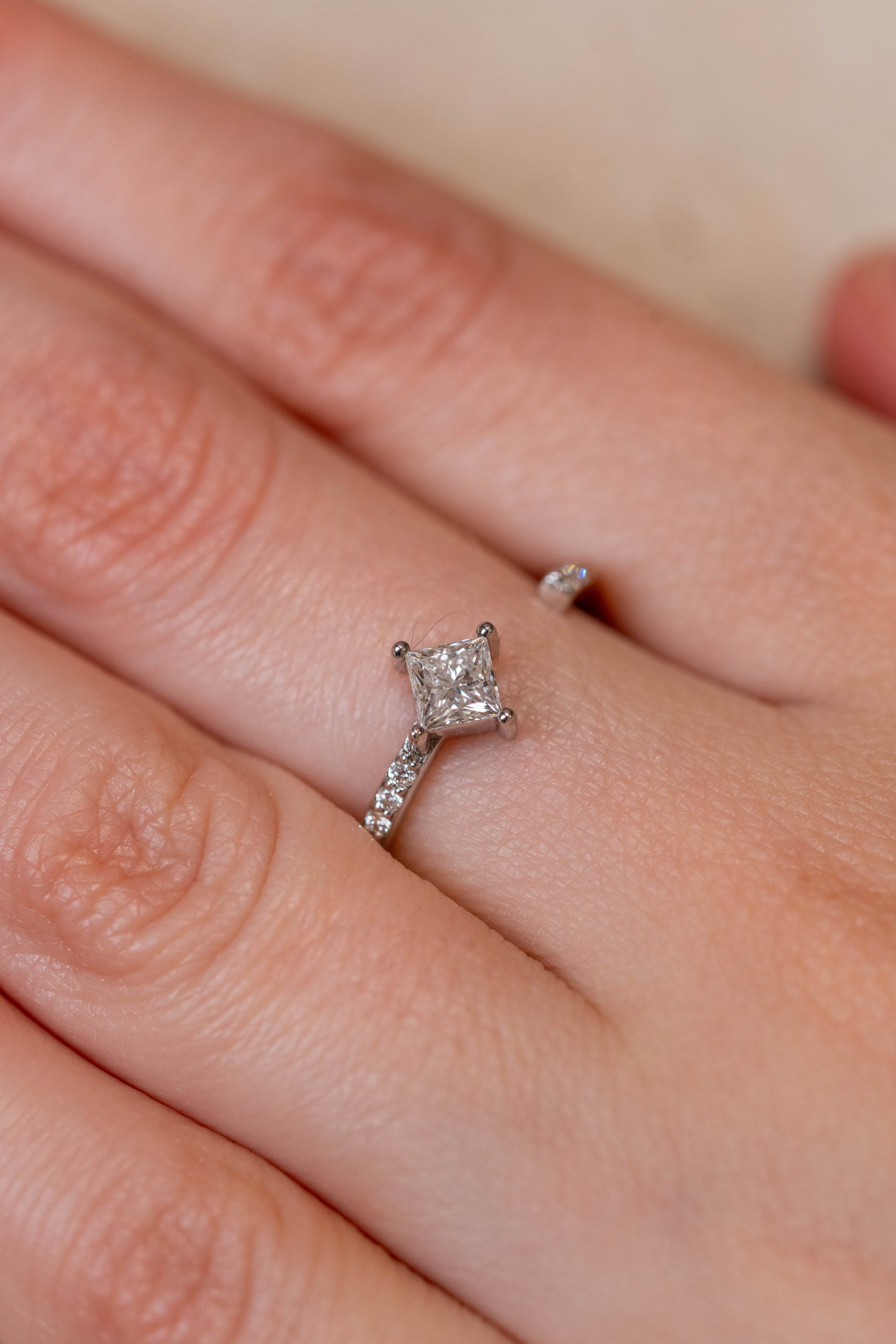 – En or 18 carats, cette bague de fiançailles présente une pierre centrale princesse de 4 mm et un pavage délicat de 13 diamants ronds.