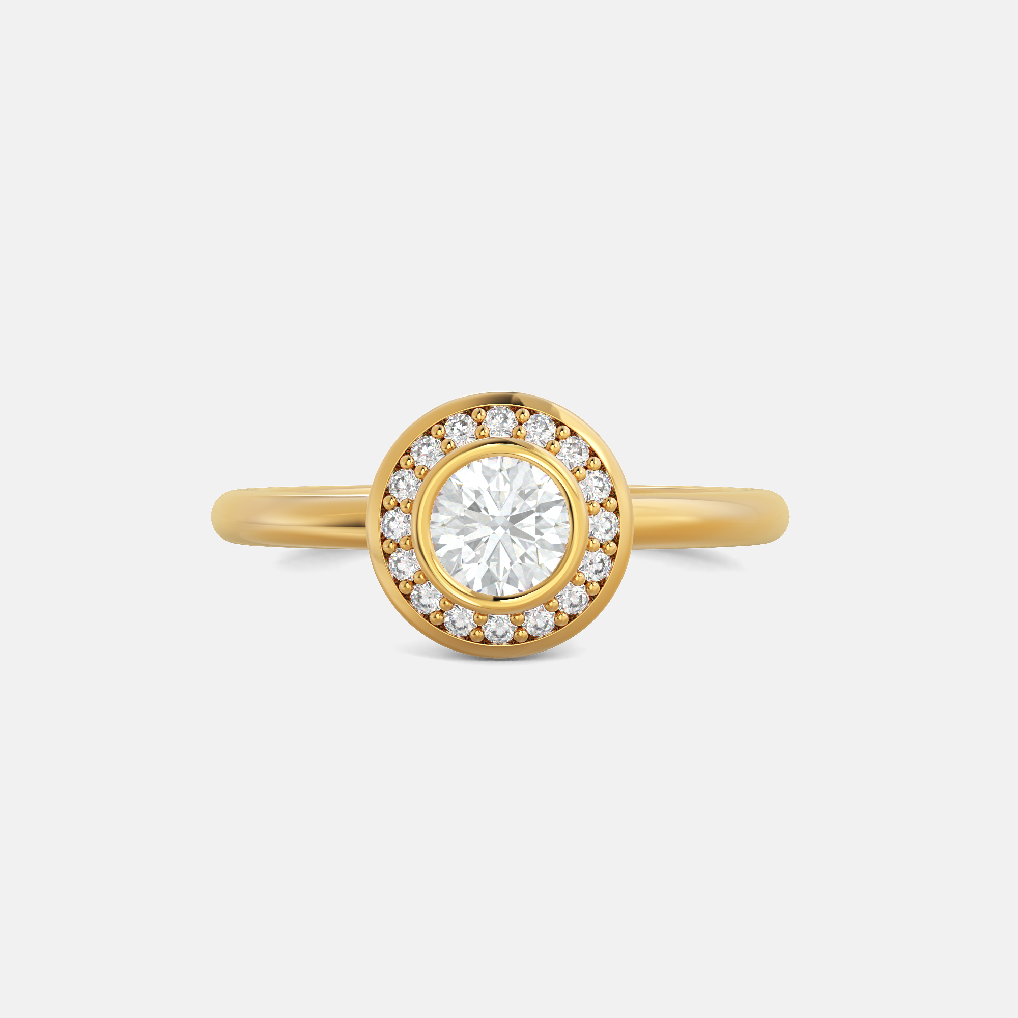 – Un solitaire de 5,0 mm entouré d’un halo de 16 diamants taille brillant pour 0,11 carats et serti sur une monture en or 18 carats.