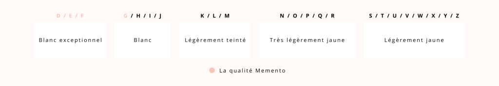 Afin de garantir à ses diamants transparence et luminosité, Memento n’utilise pour ses bijoux que des diamants de couleur D, E et G.