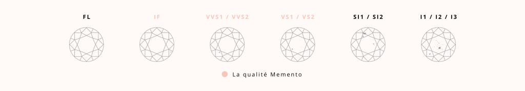 Chez Memento, nous proposons la qualité GVS qui correspond à des diamants blanc extra + quasiment incolores et qui n’ont aucune inclusion visible à l’œil nu et difficilement visibles à la loupe grossissante x10. Nous avons choisi de proposer cette qualité sur l’ensemble de nos diamants pour le bon rapport qualité prix qu’elle offre.