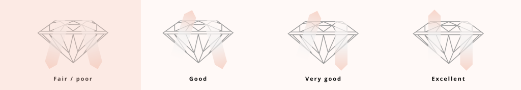 La qualité de la taille est définie par trois critères : la symétrie, les proportions et le polissage de la pierre. Ces trois critères additionnés déterminent le “cut grade” qui est une échelle allant de “fair/poor à “excellent”.